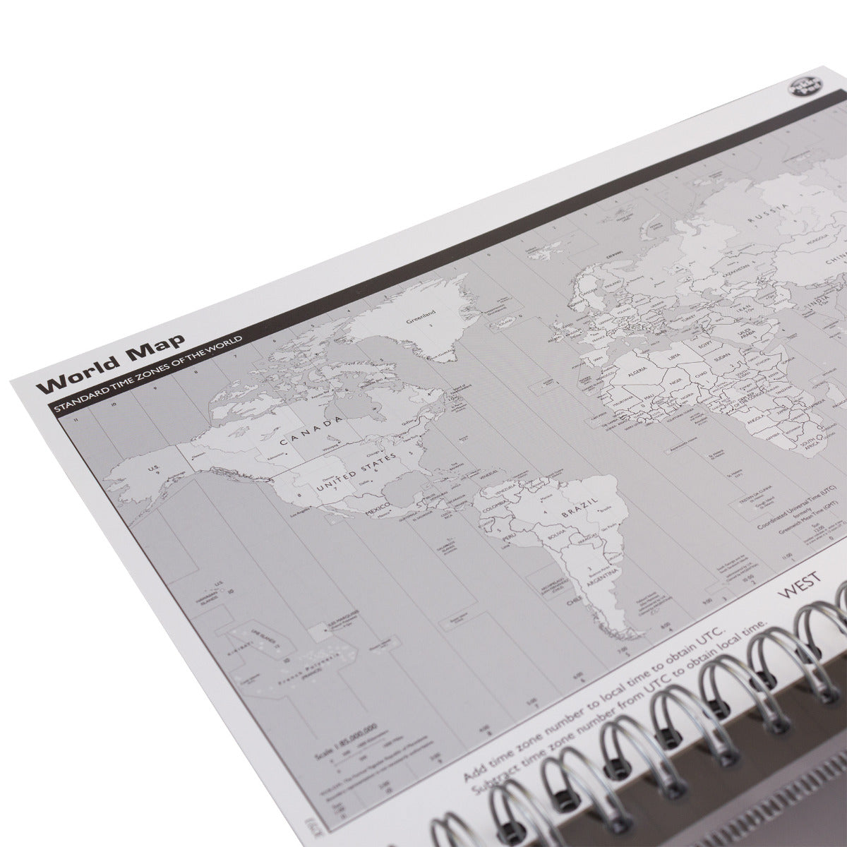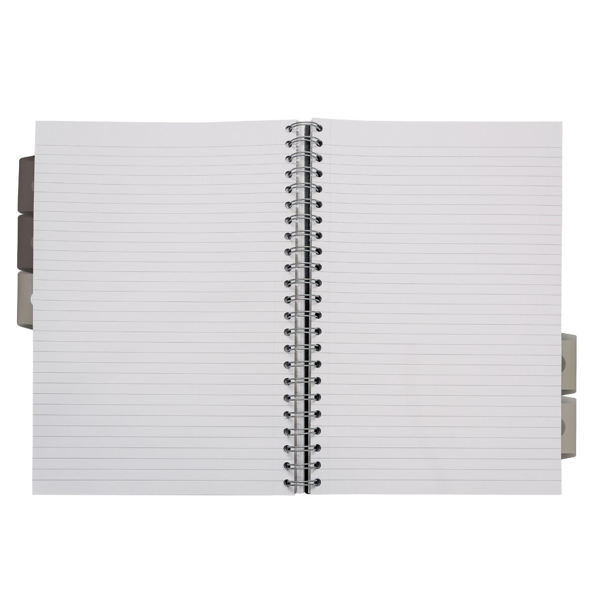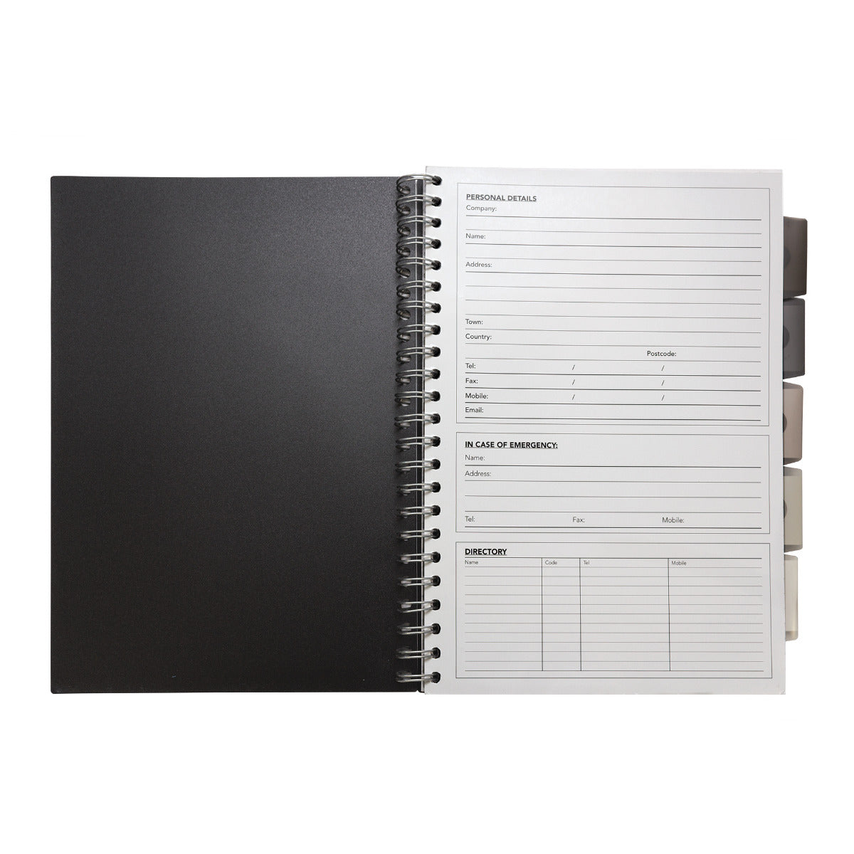 Each notebook is A4 in size measuring W: 210mm x H: 297mm and features a durable polyprop front cover that can be wiped clean, this ensures your notes stay in tip-top condition and you are staying covid compliant. Inside the notepad, there is a personal details page and a world map, as well as 5 colour-coded repositionable dividers with storage pockets for loose documents.