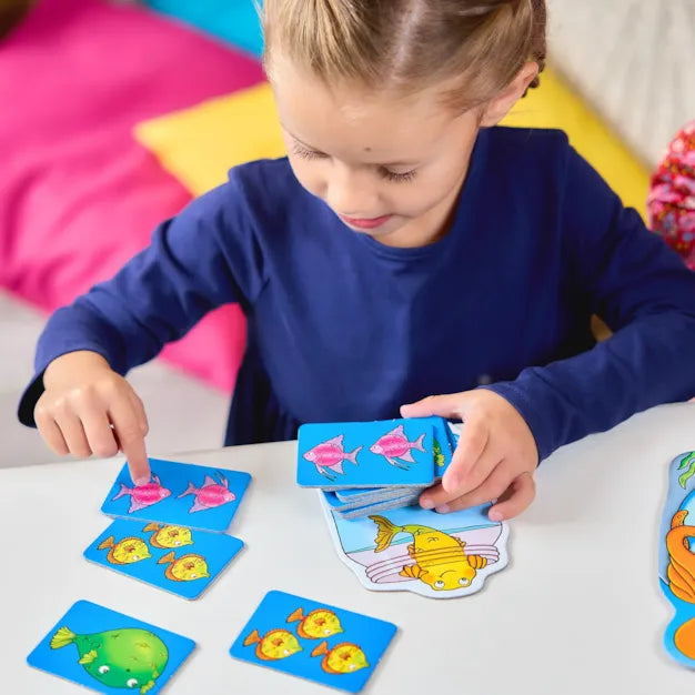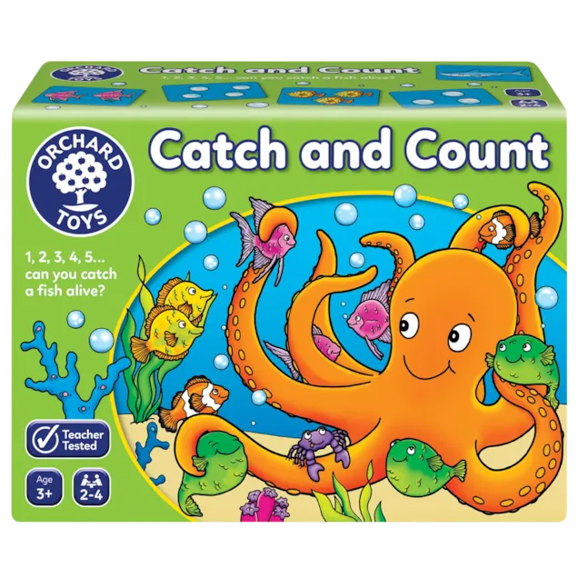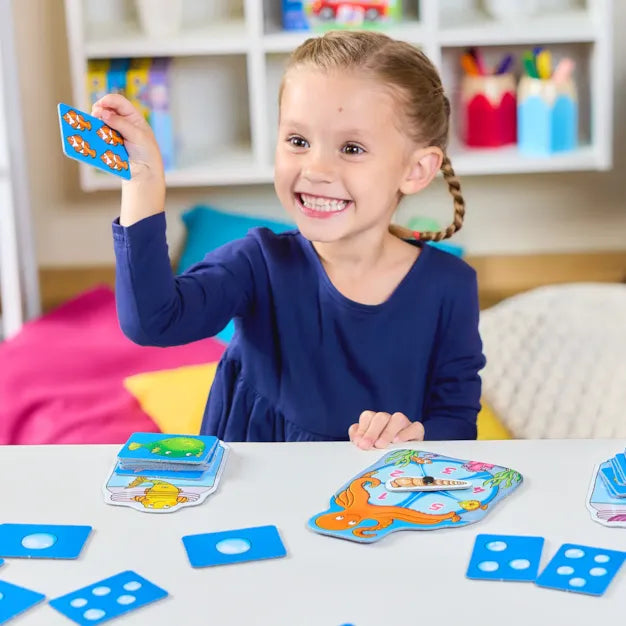 Spin the octopus spinner to see how many fish you can catch, but do take care...there's a shark out there! Spin the spinner, count the number of bubbles and collect the matching cards on your fish board. But watch out! If you turn over a shark card, it will eat all of your fish and you'll have to start again! The player with the most fish at the end of the game is the winner!