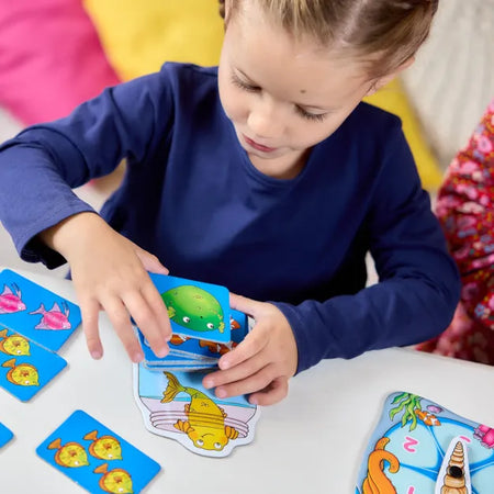 The excitement of this game is in the anticipation of turning over cards...will you turn over a shark card or collect more fish?! Children will also love the fun shell spinner. Player boards and cards feature a number of friendly sea creatures, including clown fish, starfish, crabs and puffer fish, and can be used to show children the different creatures that live underwater.