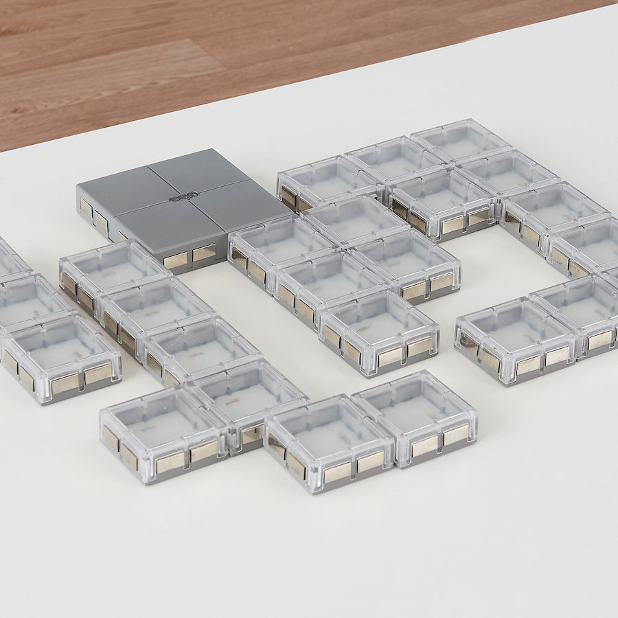 Each tile has 2 magnets on each side. The tiles will light up when north and south are joined together. Please note that to power the tiles, they must be connected to the power hub. If north and north/south and south are joined, the tiles will not glow.