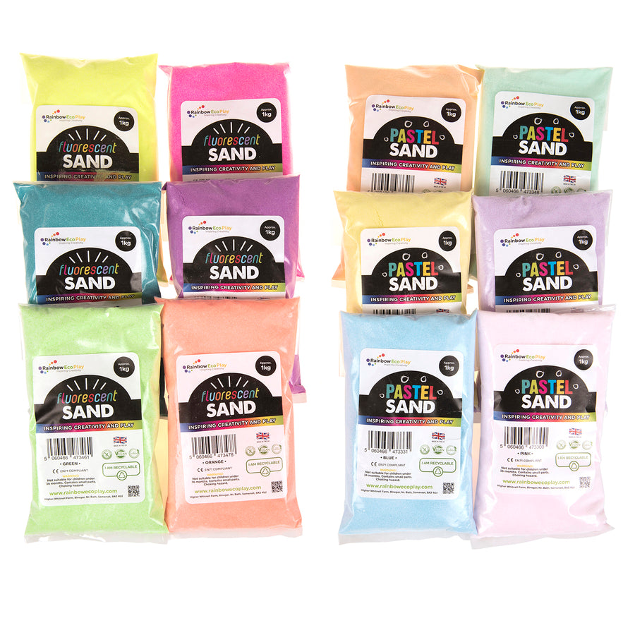 Resealable bags of coloured sand for crafts, made from 100% natural minerals.