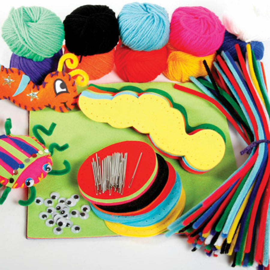 Set includes; 2 different 3D designs a caterpillar and beetle, makes 15 of each bug, coloured yarn, needles, 60 felt cut outs, stuffing, sequins, wobbly eyes and pipe cleaners.